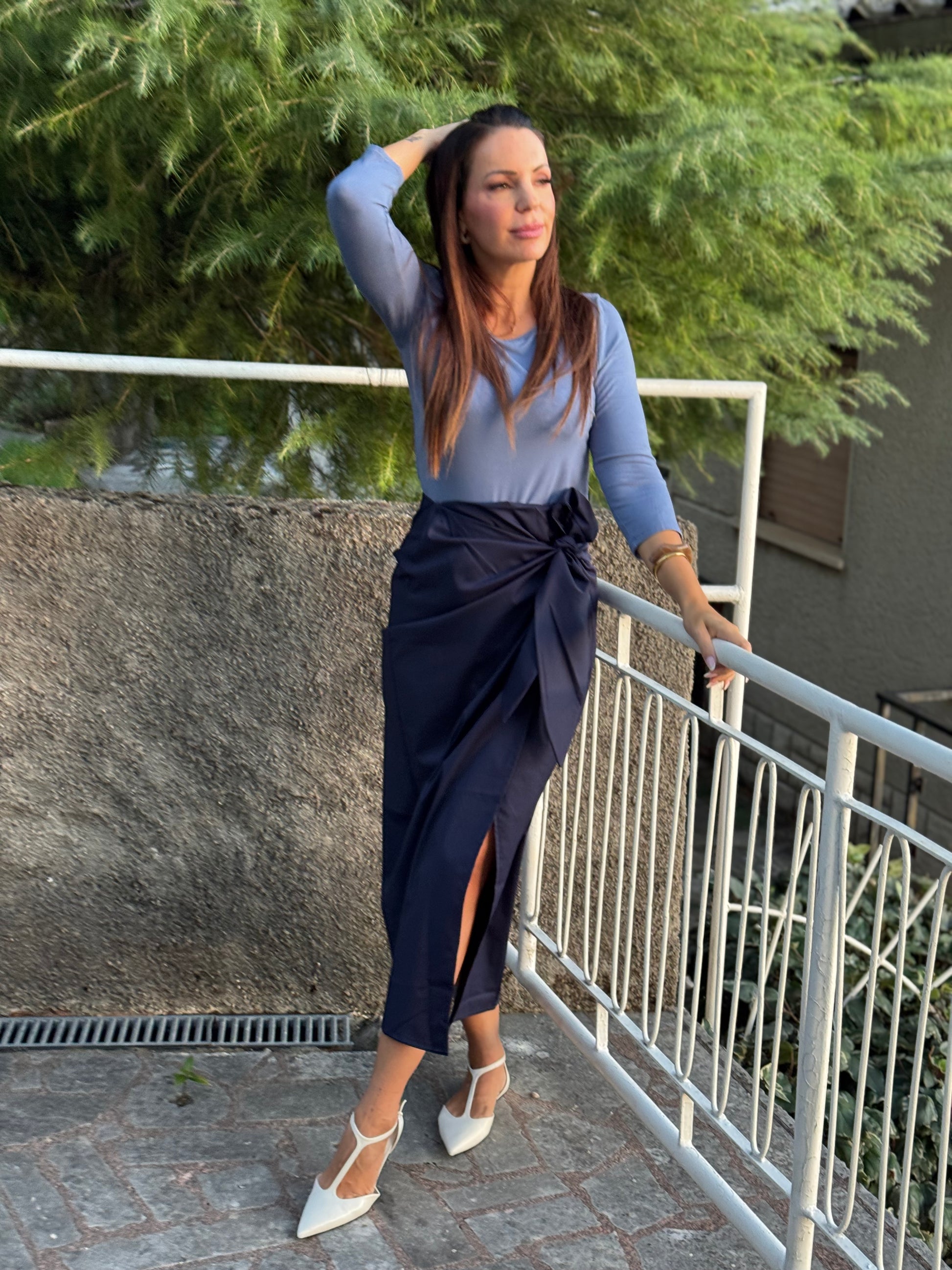Plava suknja na preklop – udobnost i elegancija za svaki dan