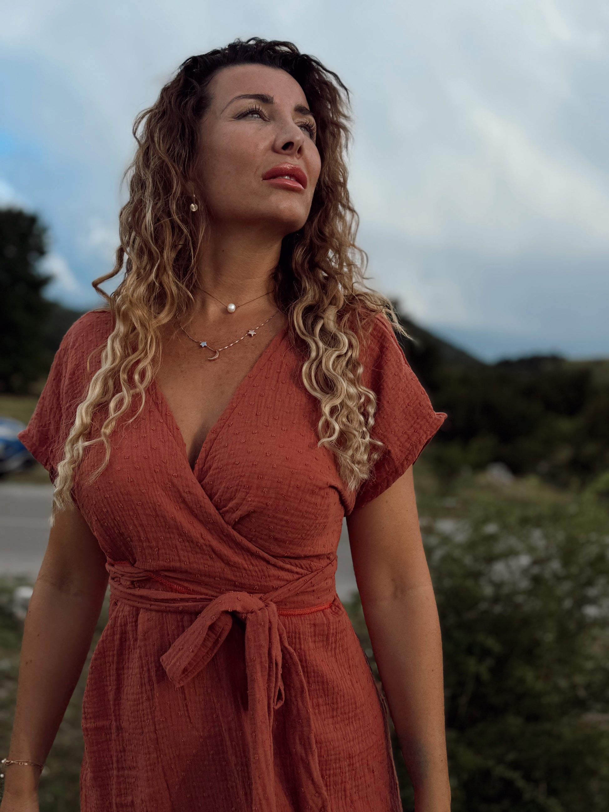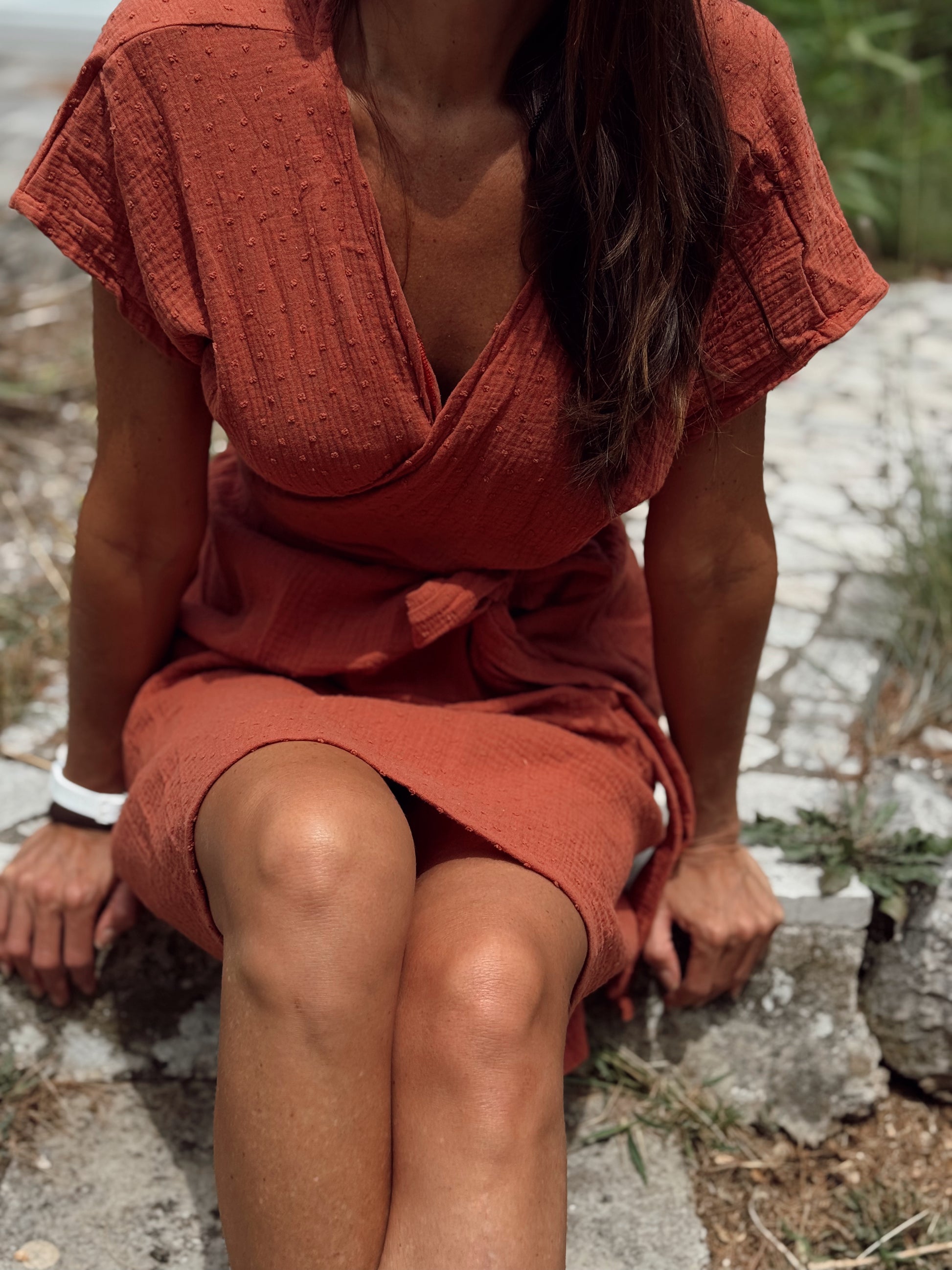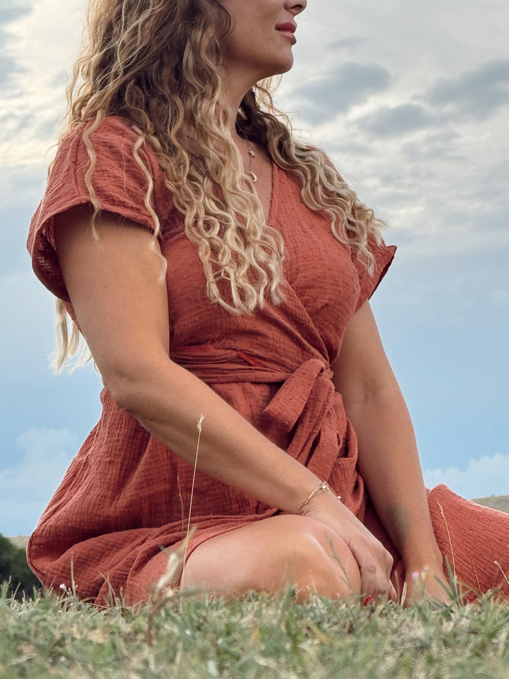 Otkrij prirodnu eleganciju i udobnost s PULSE bež haljinom izrađenom od 100 % organskog pamuka. Ova lagana ljetna haljina s kratkim rukavima i twist detaljem u predjelu prsa pruža profinjen, ženstven izgled uz maksimalnu udobnost. Mekani, prozračni materijal nježan je prema koži, idealan za tople dane i ljetne šetnje.