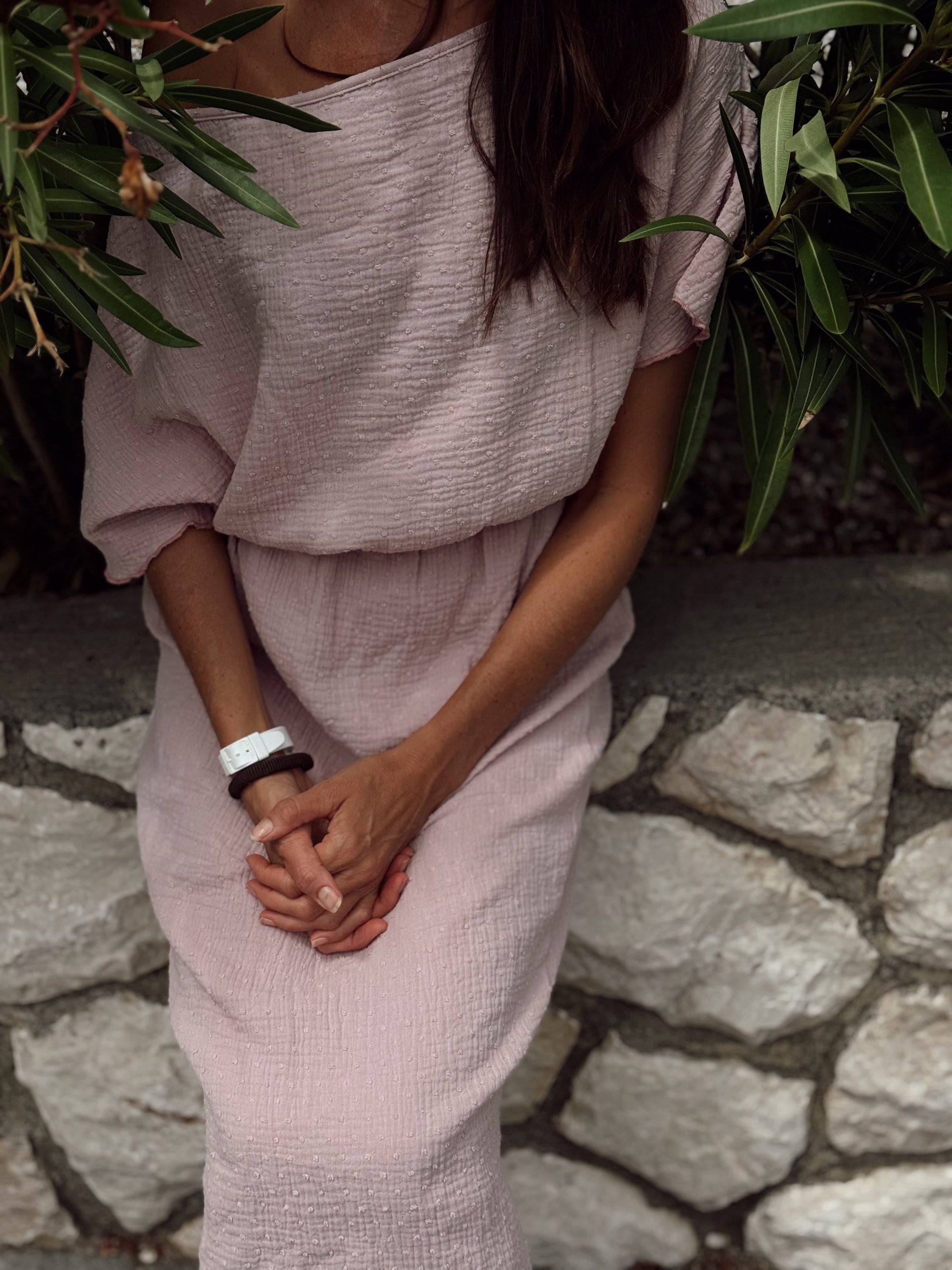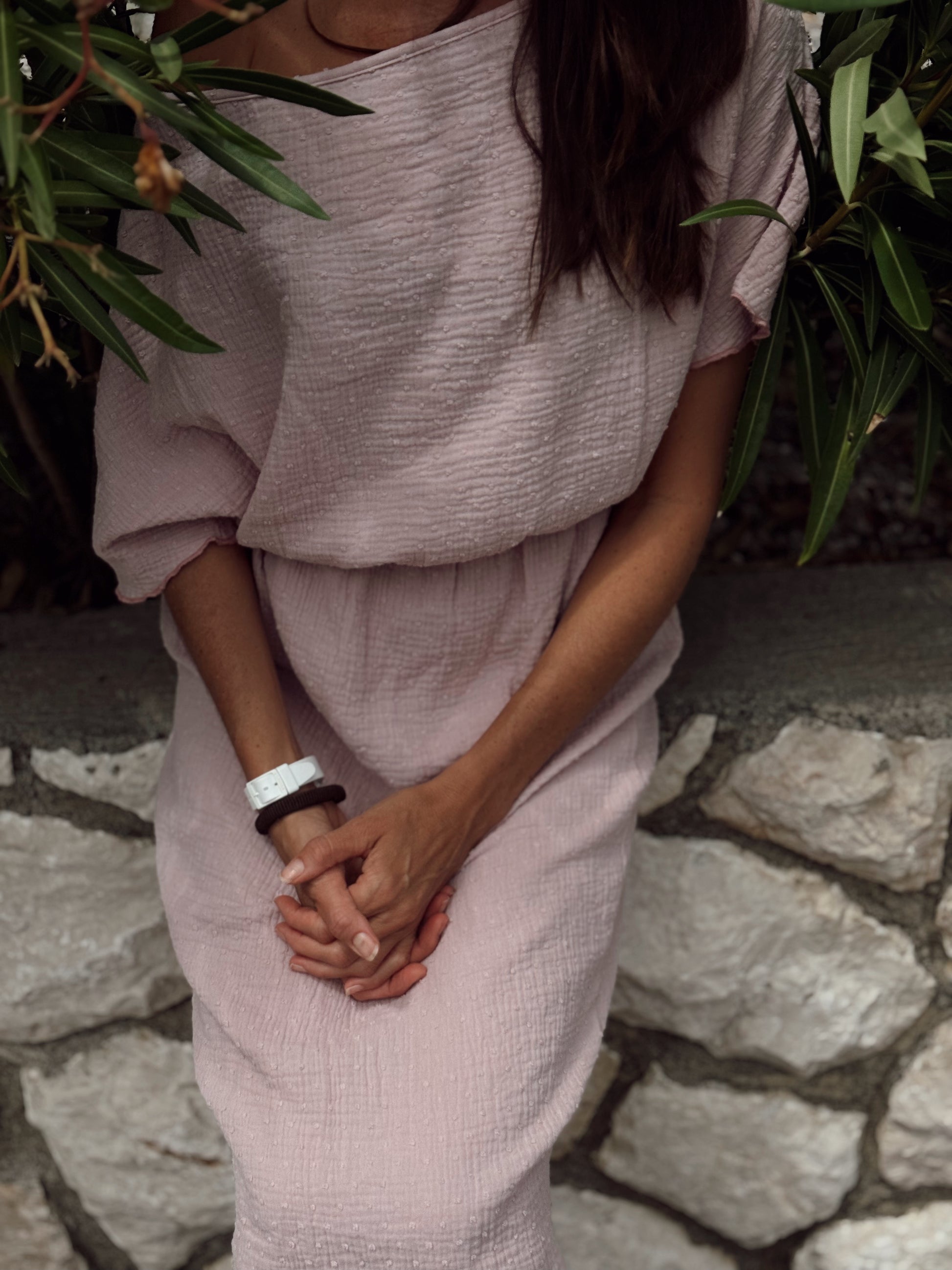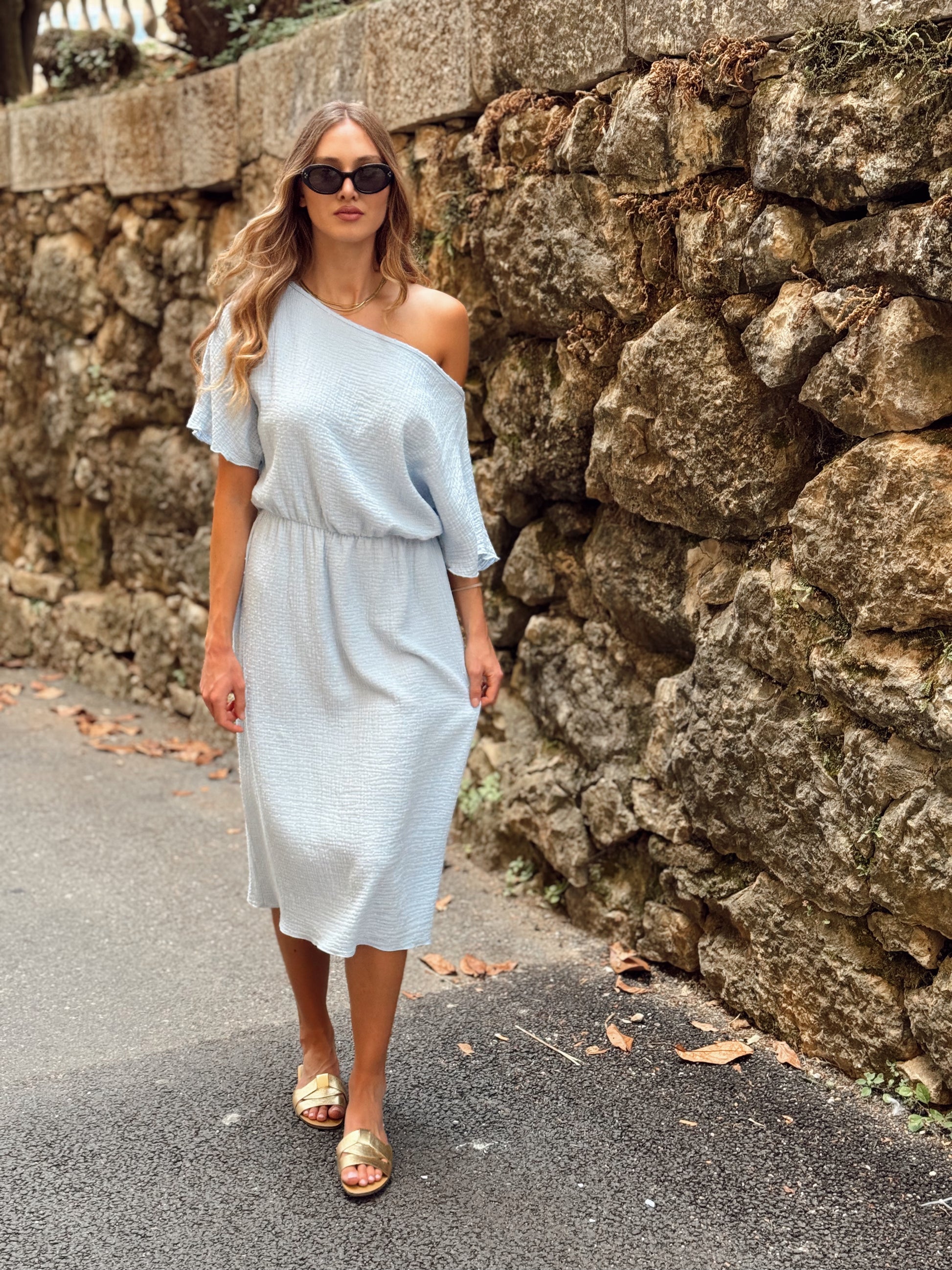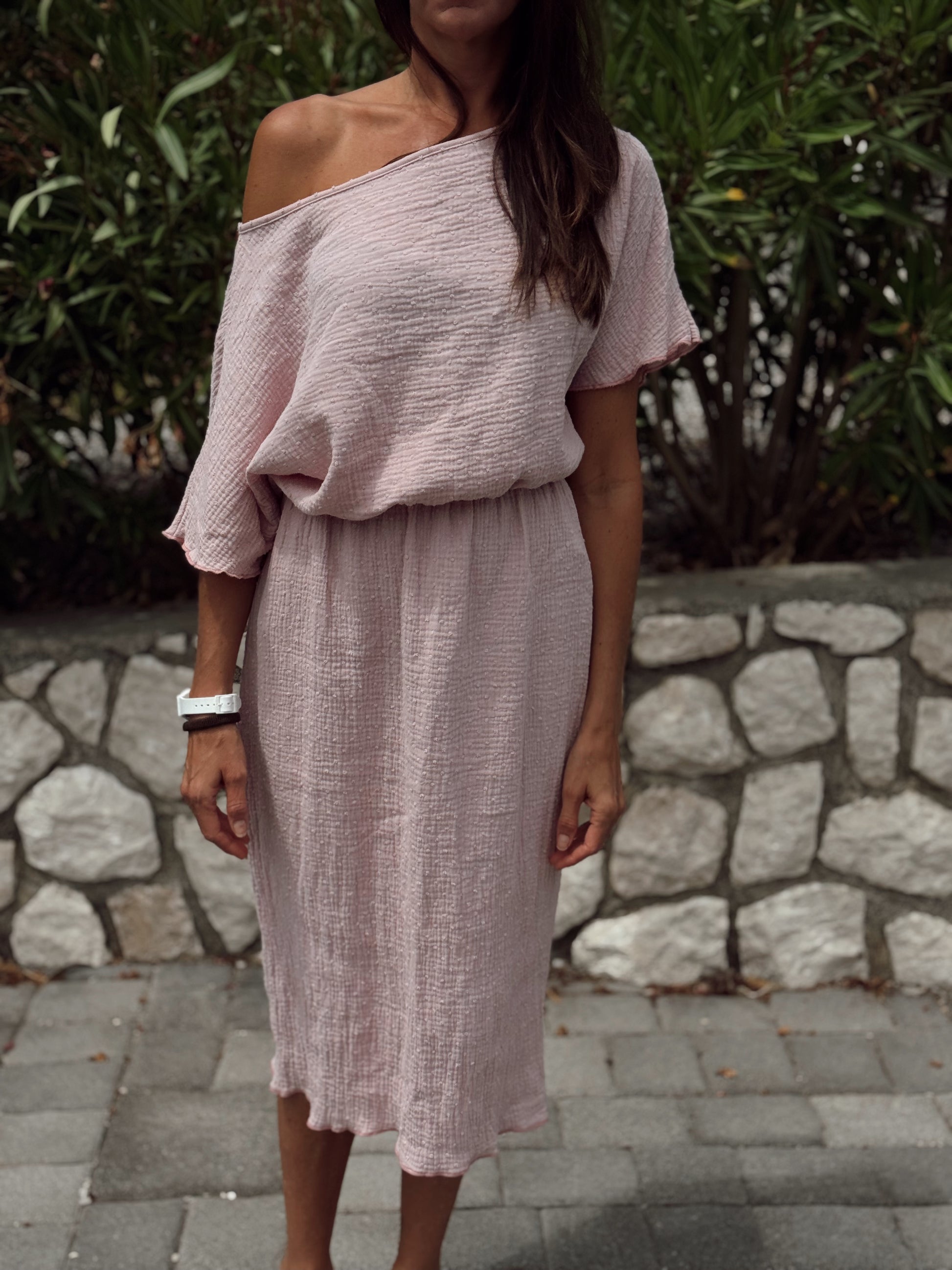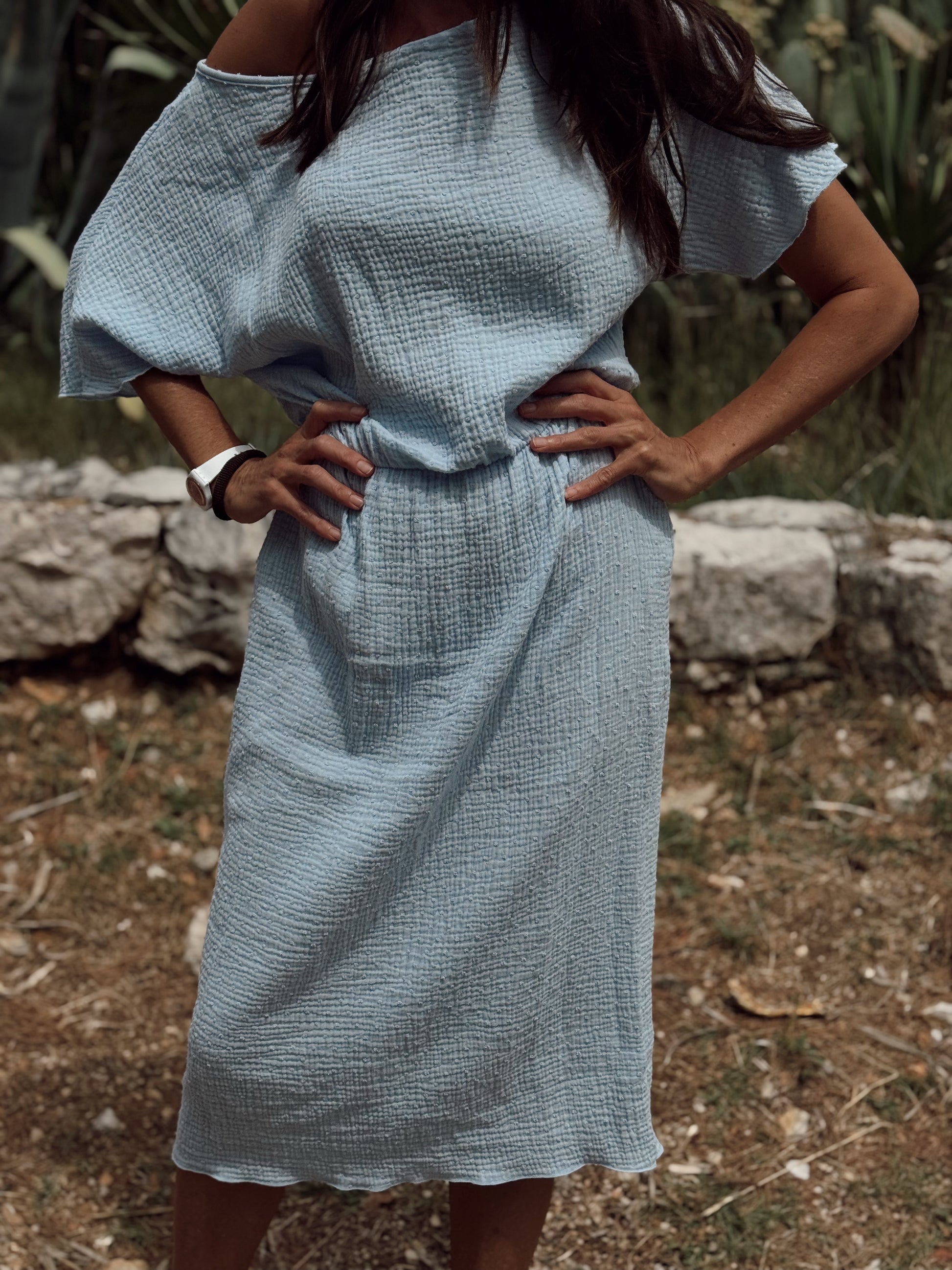 Pulse haljina s golim ramenom od pamučnog muslina, dostupna u puderastoj i svjetlo plavoj boji te veličinama S, M i L. Ljetna, prozračna i ženstvena.