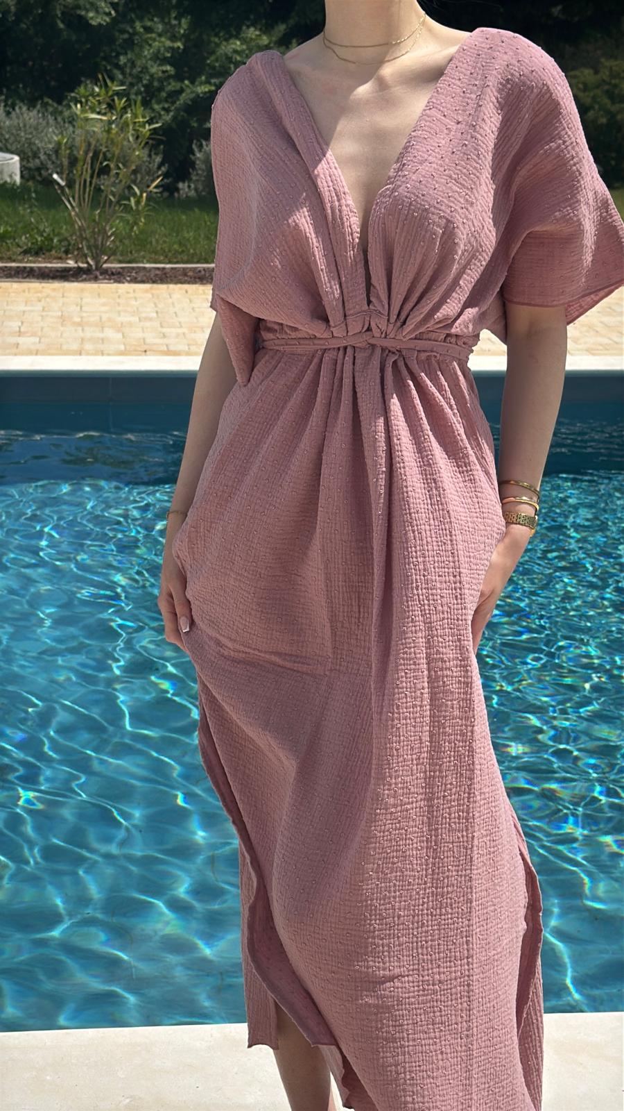 Ova kimono haljina spoj je udobnosti i sofisticiranosti. Izrađena od 100% pamučnog muslina, idealna je za vruće ljetne dane i večernje šetnje. Pojas u struku naglašava figuru, dok lepršav kroj daje osjećaj slobode i lakoće.