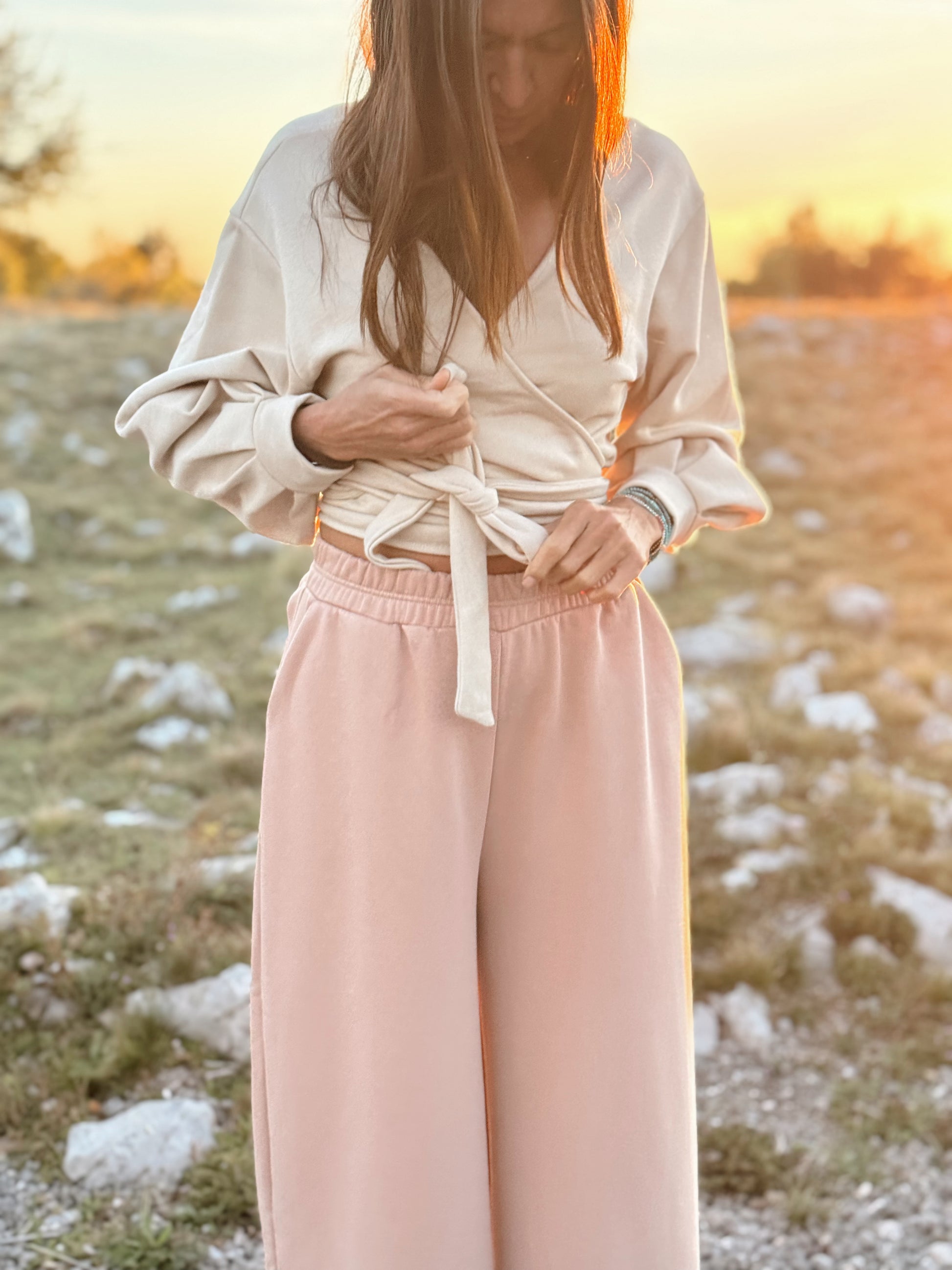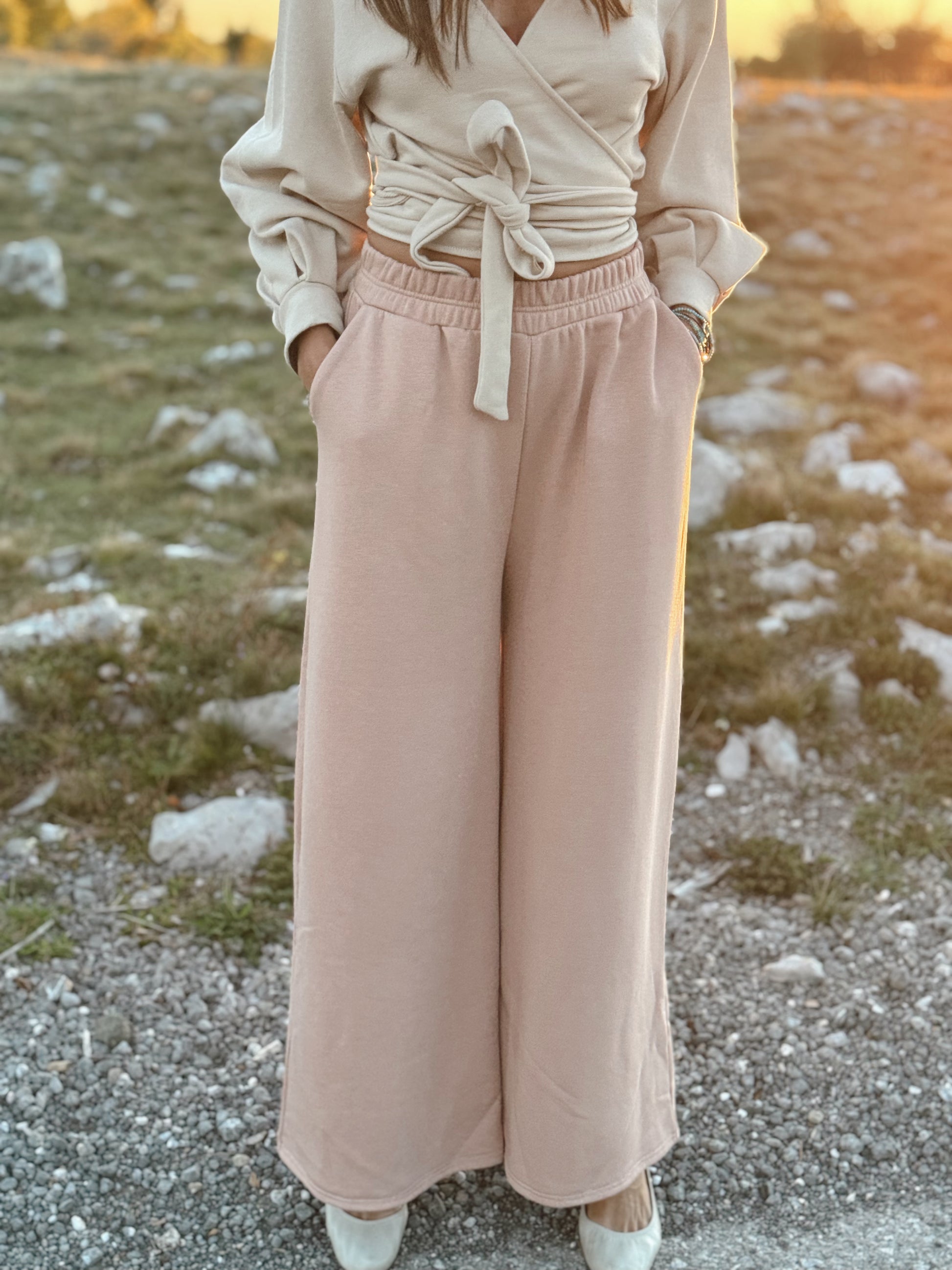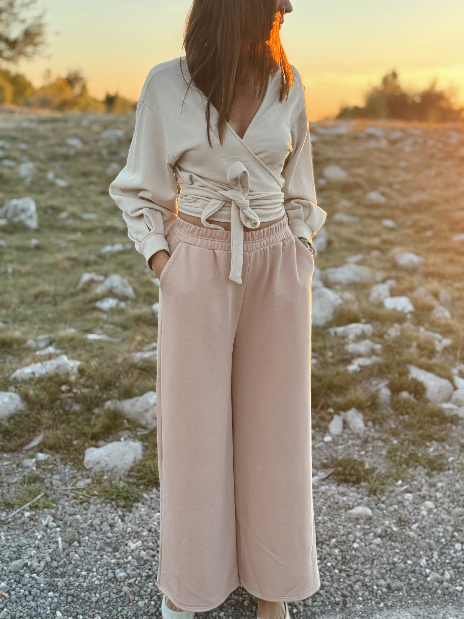 Pulse široke hlače u nude rozoj boji, izrađene od laganog pamuka. Udobne i stylish, idealne za svaki dan.