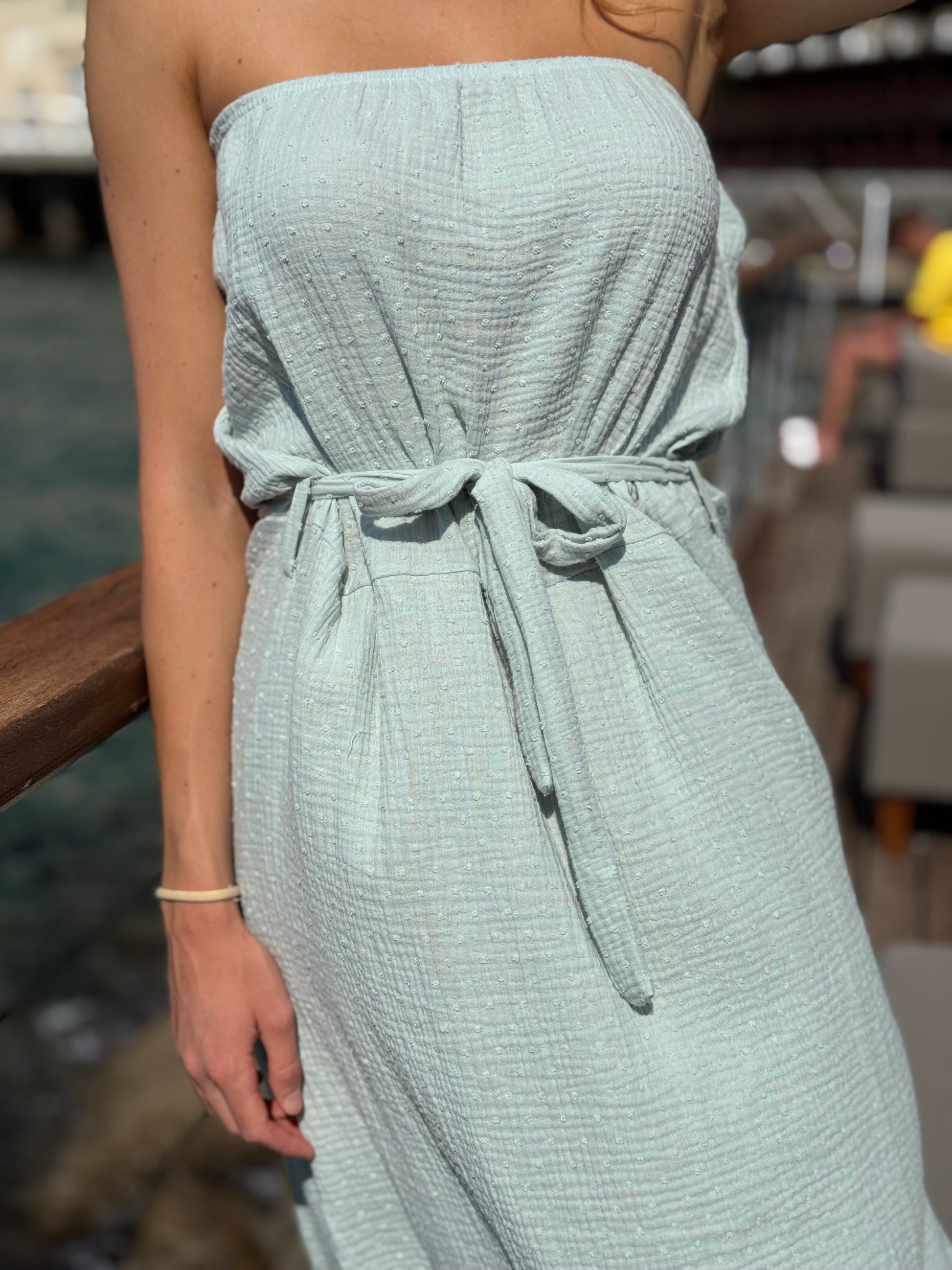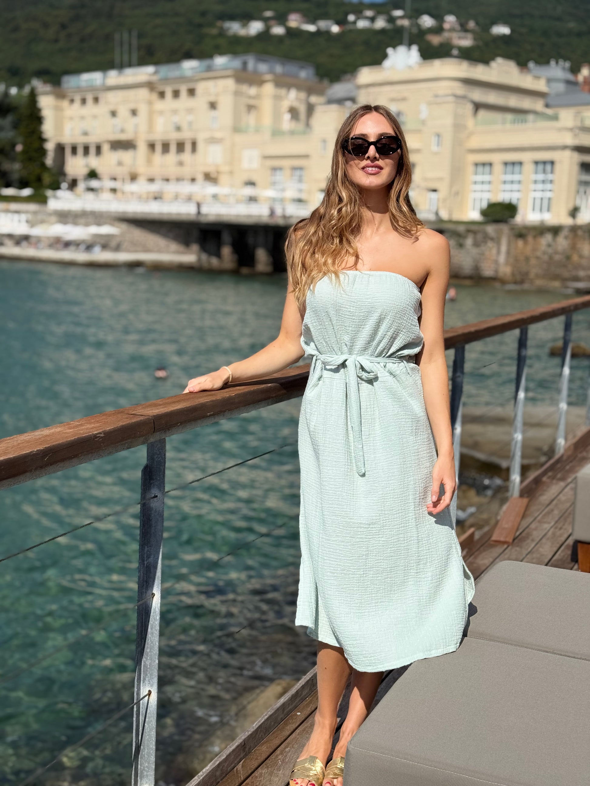 Ova haljina bez naramenica izrađena je od mekanog, prozračnog pamuka s blagom teksturom koja pruža prirodnu udobnost i sofisticiran izgled. Elastičan struk i ležeran kroj osiguravaju da se prilagođava svakoj figuri, dok midi dužina i minimalistički dizajn čine ovaj model idealnim za tople ljetne dane, plažu, gradske šetnje ili večernje izlazke.